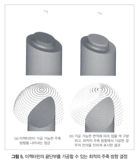 그림 5에 이젝터핀의 끝단부를 가공할 수 있는 주축 방향의 후보를 계산하고, 다음으로 앞에서 말한 방법을 이용해 최적의 주축 방향을 결정한 모양을 나타냈다.