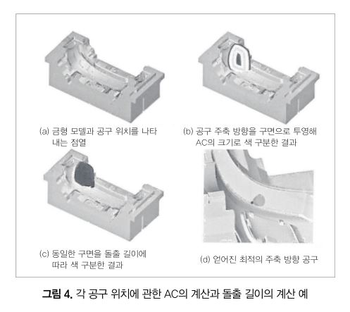 그림 4에 금형 모델과 모델 상에 지시된 공구 위치의 정보를 이용해 각 주축 방향에 대해 AC를 계산하고, 또한 타당한 주축 방향에 대해 돌출 길이를 계산한 결과를 나타냈다. 이들 계산에 걸리는 시간은 최신 GPU를 이용하면 몇 분이다.