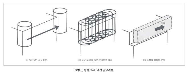그러나 공구가 직선 이동하는 경우에는 가공된 형상은 항상 이동하는 공구의 뒤쪽 측에 존재하기 때문에 가공 결과가 뒤의 가공에 영향을 미치지 않는다. 따라서 공구가 직선적으로 이동하는 경우에는 그 경로 상의 여러 개의 CWE를 병렬로 계산하는 것이 가능해진다.