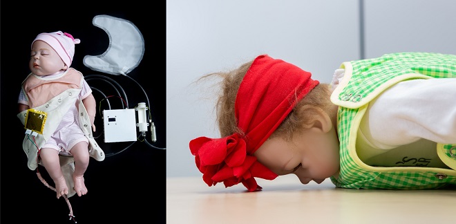 ▲(왼쪽)영아 질식사를 방지하는 웨어러블 에어백 시제품과 (오른쪽)영아가 엎드렸을 때 에어백이 2.5㎝가량 부풀어 올라 기도가 확보된 모습