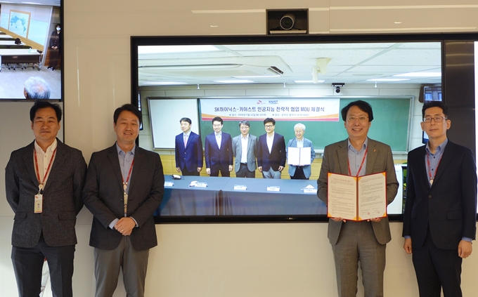 SK하이닉스가 한국과학기술원(KAIST)과 손잡고 인공지능(AI) 기술을 활용해 반도체 난제 해결에 나선다. 양측은 5월 12일 KAIST 박현욱 부총장, 문재균 전기 및 전자공학부 학부장, SK하이닉스 송창록 DT(Data Transformation) 담당 등이 참석한 가운데 원격 화상회의로 ‘인공지능 전략적 협업 양해각서(MOU)’를 체결했다.