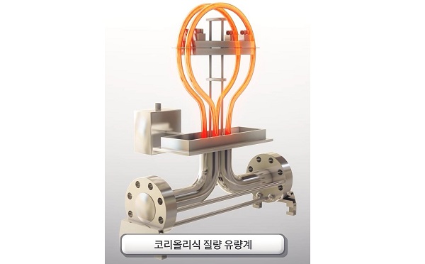 ▲코리올리식 유량계. 코리올리힘(Coriolis force)의 원리를 이용, 일정하게 진동하고 있는 배관에 흐르는 유체의 질량유량에 따라 배관의 비틀림현상이 비례하게 발생하는 방식으로 질량 유량을 측정하는 유량계.
