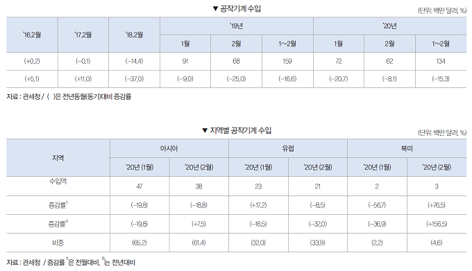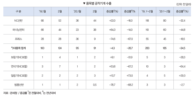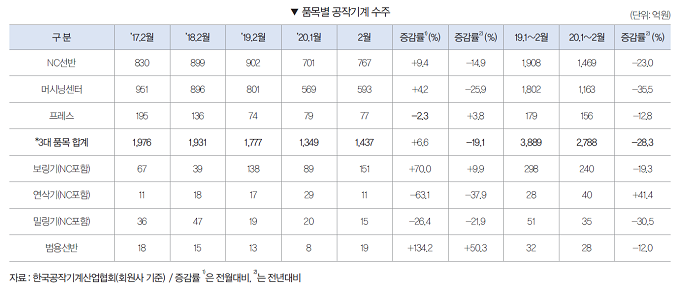 2020년 1~2월 공작기계 수주는 3479억원으로 전년동기대비 31.4% 감소했다. 내수수주는 1696억원으로 전년동기대비 26.9% 감소했으며, 수출수주 또한 1783억원으로 전년동기대비 35.1% 감소했다.