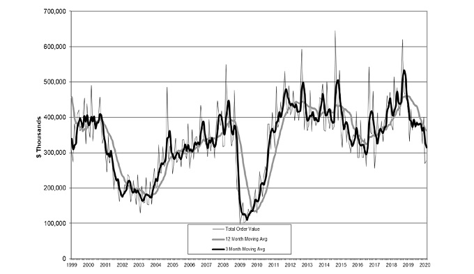 ▼ 2020년 2월 미국 공작기계 수주 현황 (Total U.S. Manufacturing Technology Orders Through February 2020)