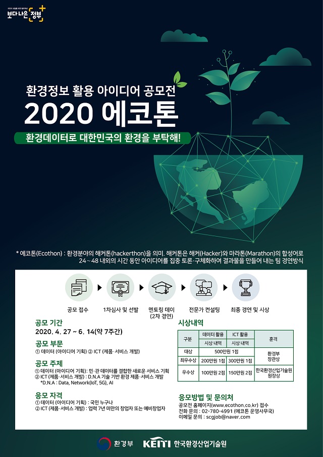 환경부와 한국환경산업기술원이 개최하는 2020 에코톤 환경정보 ICT 아이디어 활용 공모전의 운영사무국은 직접 관심을 갖고 아이디어를 고민하는 20대들의 문의가 이어지고 있다고 전했다.