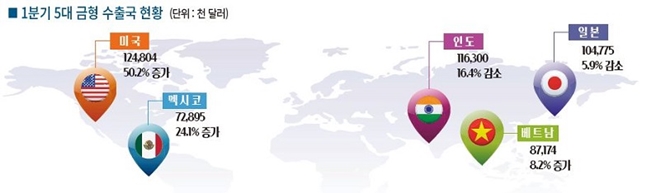 올해 1사분기 금형 수출 현황을 국가별로 자세히 살펴보면, 지난해 1사4분기 1억 달러를 넘어선 수출국은 인도와 일본 두 국가였던 반면, 올해는 미국을 필두로 인도, 일본 등에 1억 달러 이상을 수출하며 고루 높은 성과를 이뤘다.