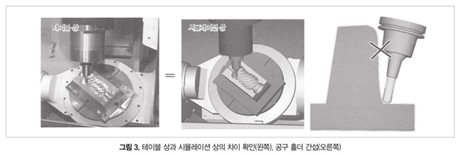 이 기능의 과제는 주축 상이나 테이블 상에 실재하는 공구․재료․지그의 형상과 설정된 모델 형상․위치가 일치하는 것을 전제로 하는 점이다. 5축가공에서는 공구를 기울려 재료에 접근시키기 때문에 공구의 길이․지름․돌출량뿐만 아니라, 공구 홀더의 형상 오류도 간섭의 위험을 높이게 된다(그림 3).