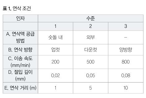 Co-Cr-Mo 합금의 연삭가공에서 연삭 특성에 영향을 미치는 요인을 조사하기 위해 L18 직교표를 이용해 연삭실험을 했다. 표에 각 인자와 수준을 나타냈다. 연삭액 공급 방법, 연삭 방향, 이송 속도, 절입 깊이, 연삭 거리의 5가지를 인자로 해 각각 수준을 정했다.