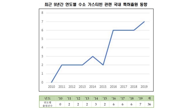 특허청에 따르면, 발전용 수소 가스터빈 관련 특허는 최근 9년간(‘11~’19년) 총 36건이 출원됐고, 매년 2건 정도에 불과하던 것이 15년 이후에는 6~7건으로 증가했다.