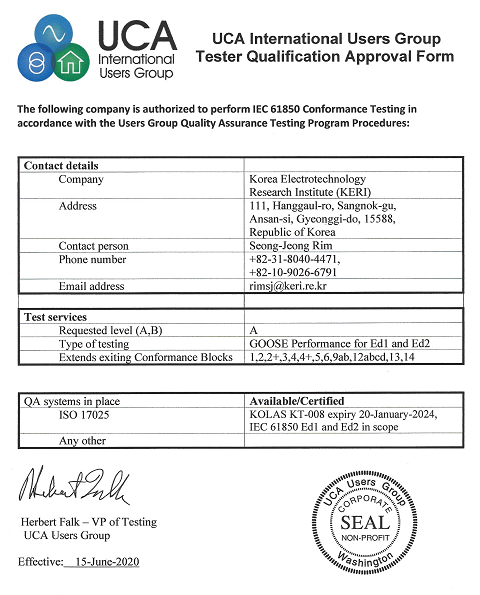 이미 KERI는 UCAIug로부터 지난 2013년 국내 최초로 ‘IEC 61850 서버 분야 제1판’ 시험 자격을 획득한 이래, ‘클라이언트 분야 제1판(2014년)’, ‘서버 분야 제2판(2015년)’, ‘클라이언트 분야 제2판(2016년)’, ‘머징유닛(Merging Unit) 분야 제1판(2018년)’ 국제공인 시험인증 자격을 보유하고 있었다.