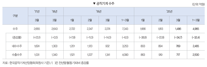 2020년 1 ~ 3월 공작기계 수주는 4965억원으로 전년동기대비 32.4% 감소했다. 내수수주는 2465억원으로 전년동기대비 24.2% 감소했으며, 수출수주 또한 2500억원으로 전년동기대비 38.9% 감소했다.