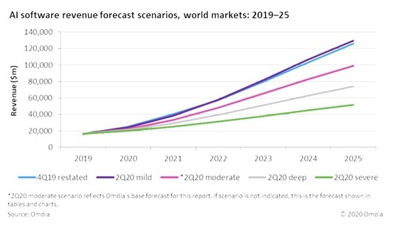 시장조사기관 옴디아(Omdia)에 따르면 인공지능 소프트웨어 시장은 앞으로도 두 자릿수 성장세를 이어갈 전망이다. 다만 2019~2025년의 누적 시장 규모가 코로나19 이전에 나온 전망보다 22% 감소될 것으로 예상되긴 한다.