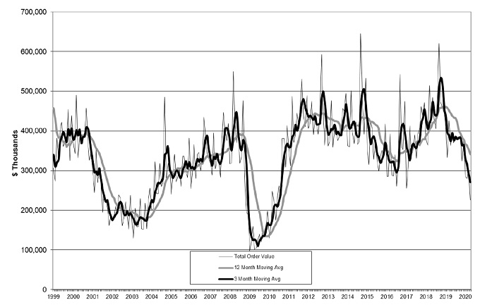 ▼ 2020년 4월 미국 공작기계 수주 현황 (Total U.S. Manufacturing Technology Orders Through April 2020)