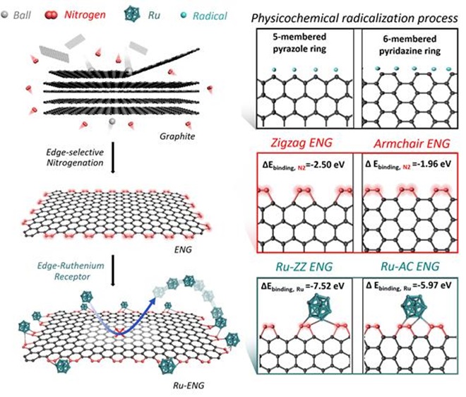 루테늄을 그래핀 가장자리에만 결합 시키는 방식을 이용해 그래핀 지지체 평면(basal plane)이 손상되는 것을 막아 효율과 내구성 모두 높다. 연구팀은 루테늄 금속을 지지해 주는 역할을 하는 그래핀의 ‘가장자리’ 부분인 ‘에지’에만 질소를 도핑(doping)하면, 루테늄이 질소를 따라 에지에만 결합하는 현상을 이용했다. 질소는 전자를 받으려는 성질이 강하고 루테늄은 전자를 주려는 성질이 강하기 때문이다.