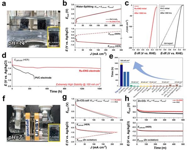 제1저자인 양예진 UNIST 에너지공학과 석·박사통합과정 연구원은 “금속과의 뛰어난 결합력을 가지는 에지(edge)를 이용해, 모든 수계 환경에서 안정적인 성능을 보이는 다 ‘Ru-ENG’(Edge-selective Nitrogenated Graphitic Nanoplates) 촉매를 개발했다”고 설명했다.