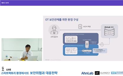 안랩 위수복 팀장이 발표하고 있는 스마트팩토리 환경에서의 보안위협과 대응전략 웨비나 화면.