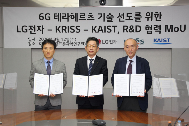LG전자는 12일 대전광역시 유성구에 위치한 한국표준과학연구원에서 한국표준과학연구원 박현민 원장, 한국과학기술원 LG-KAIST 6G 연구센터 조동호 센터장, LG전자 C&M 표준연구소 김병훈 소장 등이 참석한 가운데 3자 업무협약(MOU)을 맺었다.