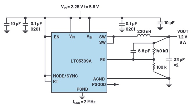 ▲ 그림2. 1.2V에서 2.25V ~ 5V 입력으로부터 1.2V출력 6A를 공급하는 LTC3309A 애플리케이션 회로도.