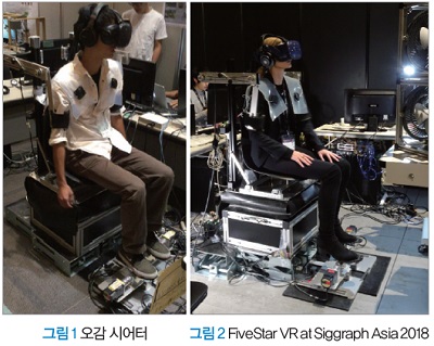 이 전시의 모습은 그림 2와 같으며, 다감각 제시 장치(FiveStar)는 Head Mounted Display(HMD)로서 VIVE Pro(1440x1600x2, HTC)와 헤드폰, 암스윙 기구, 전정감각 디스플레이, 다리 구동장치, 진동 제시장치, 기류 디스플레이, 냄새 제시장치 등으로 구성되어 있다.