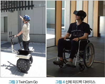 이 구성에 의해 TwinCam의 설치 장소가 변화하지 않는 경우는 머리부를 회전한 방향의 시차붙이 영상이 겉보기 상 지연 없이 제시되지만, TwinCam이 Segyway 주행으로 이동하는 경우는 단안시의 경우보다 운동 멀미의 가능성이 있다. 그렇기 때문에 TwinCam Go 시스템은 카메라의 운동에 대응하는 신체의 가속도를 주는 것으로 지각 정보의 통합 과정을 보정해 영상 멀미를 감소(그림 7)시키고 있다. 이 경우 가속도의 피드백은 가속도계로 측정된 일정 이상의 가속도에 대해 Segway 운동과 동일한 방향으로 제시된다. 그때의 가속도는 카메라의 운동 측정값보다 작고, 더구나 단시간에 충분한 효과가 있으며, 또한 보통의 모션 베이스와 동일하게 임계값 이하의 아주 작은 가속도로 초기 위치로 되돌아가도록 제어되어 있다.