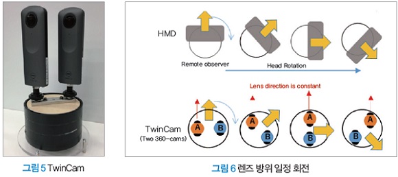 체험자의 머리부 회전은 카메라 시스템(TwinCam, 그림 5)에 전송되고, 입체시를 하는 정면 방위가 지시된다. 이것에 대해 TwinCam은 카메라의 위치를 모터에 의해 회전시켜 정면 방향으로 2개의 카메라를 돌린다. 이때 렌즈의 광축 방위를 일정하게 유지함으로써(그림 6) 운동 둔화가 거의 생기지 않는 영상을 얻을 수 있게 되어 있다. 영상은 전방위이기 때문에 모터 회전, 영상 취득 및 압축 전송에 관련된 지연이 있는 경우에도 머리부 회전에 대해 지연 없이 HMD 영상은 갱신되기 때문에 영상 멀미는 거의 억제된다. 모터 회전 지연으로 렌즈 위치가 단시간 머리부 방위와 오차를 발생시키지만, 그것은 양안시차로 한정된다.