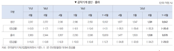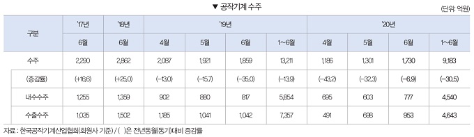 2020년 1~6월 공작기계 수주는 9,183억원으로 전년동기대비 30.5% 감소했다. 내수수주는 4,540억원으로 전년동기대비 22.4% 감소하였으며, 수출수주 또한 4,643억원으로 전년동기대비 36.9% 감소했다.