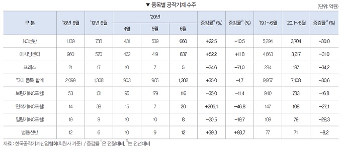 2020년 6월 품목별 수주를 보면, NC절삭기계는 전월대비 33.4% 증가한 1,693억원을, 범용절삭기계는 전월대비 38.5% 증가한 32억원을 기록했다. 반면 성형기계는 전월대비 40.5% 감소한 5억원을 기록했다.