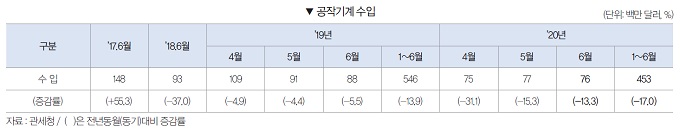 2020년 6월 공작기계 수입은 7,600만 달러로 전월대비 0.8% 감소하였다. 전년동월대비로도 13.3% 감소했다. 2020년 1∼6월 공작기계 수입은 4억5,300만 달러로 전년동기대비 17.0% 감소했다.