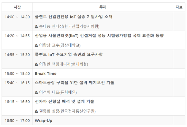 두 번째 발표는 ‘산업용 사물인터넷(IIoT) 간섭거절 성능 시험평가방법 국제 표준화 동향’으로 이왕상 경상대학교 교수가 발표한다. 이어 세 번째 발표에서는 이정한 현대제철 책임매니저가 ‘플랜트 IoT 수요기업 측면의 유구사항’에 대해 설명한다.