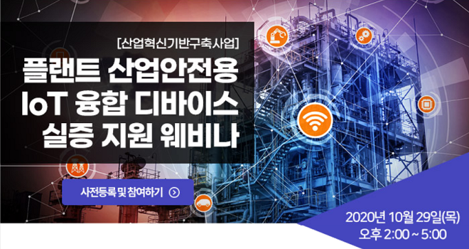 이번 웨비나는 온라인(플랜트 산업안정용 IoT 융합 디바이스 실증 지원 웨비나)을 통해 사전등록 할 수 있으며 참가비는 무료다.