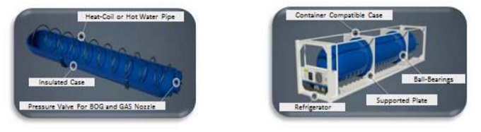 그러나 일반적으로, 수천 TEU 급으로 적재 운송되는 탱크 컨테이너와 같은 운송용기에 일일이 전력선을 연결하고 냉동기를 운용하는 것은 현실적으로 많은 제약이 따르며, 따라서 컨테이너선과 같은 기존 선박을 이용하여 대량으로 탱크 컨테이너와 같은 운송용기를 장거리 운송하기 위해서는, 상평형 유지를 위한 적절한 온도, 압력조건 유지와 자연적으로 발생하는 증발가스(BOG)에 대한 관리가 필요하다는 문제가 있다