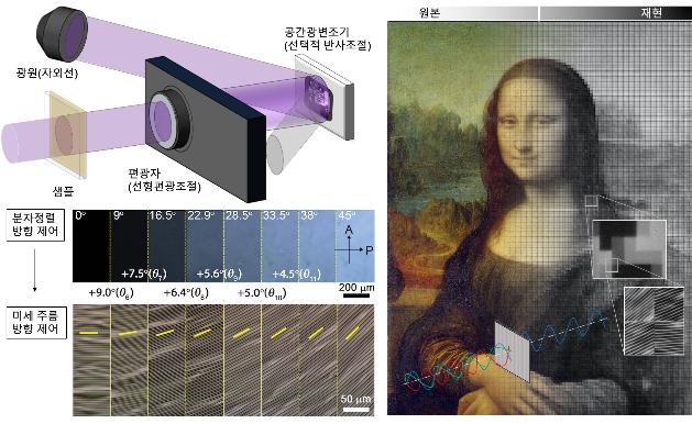 연구팀은 먼저 공간 광변조기의 미세거울 수십만개를 하나씩 제어해 빛을 원하는 패턴대로 반사했다. 이어 편광자로 진동 방향을 조절, 액정성 고분자 표면에 주름 방향이 제각각 다른 복합 패턴을 만들어냈다.