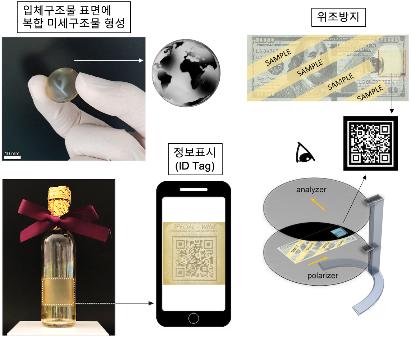 실제 연구팀은 지폐나 와인병 라벨 표면에 맨눈으로 보이지 않는 미세 주름을 만드는 데 성공했다.이 미세주름은 직교된 편광자를 통해서만 확인할 수 있다.