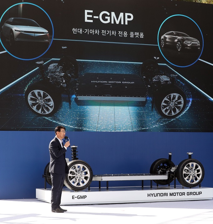 사진. 이원희 현대자동차 사장이 30일 오전 현대자동차 울산공장에서 열린 '미래차 전략 토크쇼'에서 현대자동차그룹의 전기차 전용 플랫폼 E-GMP에 대해서 설명하고 있다. (출처: 연합뉴스)
