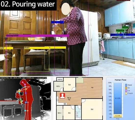 ▲고령자의 일상행동을 촬영해 멀티모달 정보를 활용하여 행동을 인식하는 기술 모습