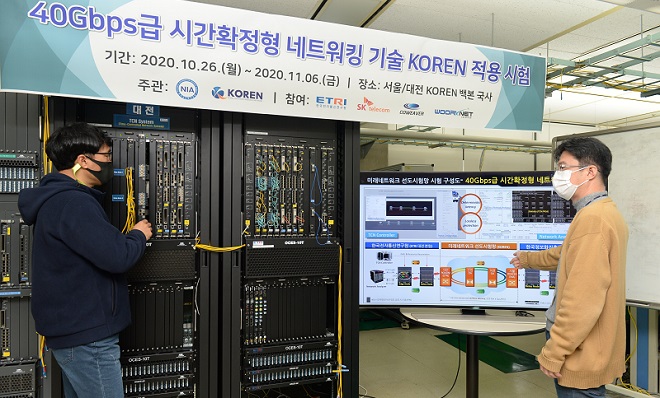 한국전자통신연구원(이하 ETRI)은 11월 6일, 데이터 전송 용량 성능 40기가급(40Gbps) 시간확정형 네트워킹 ‘뎃넷(DetNet, Deterministic Networking. IP 또는 MPLS 기반 시간확정형 네트워킹 기술)’ 핵심기술을 개발, 해당 기술이 적용된 시스템 시제품을 KOREN(초연결 지능형 연구개발망)에 연동해 서울-대전 간 왕복 430km 구간 현장 검증에 성공했다고 밝혔다.