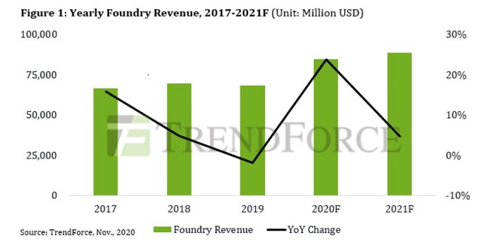 트렌드포스는 "재택근무와 원격교육, 5G 스마트폰 확산, 전기통신 기반시설 확장 등에 따른 반도체 수요가 코로나19 세계 경제 위기에도 시장 성장을 이끌었다"고 설명했다.