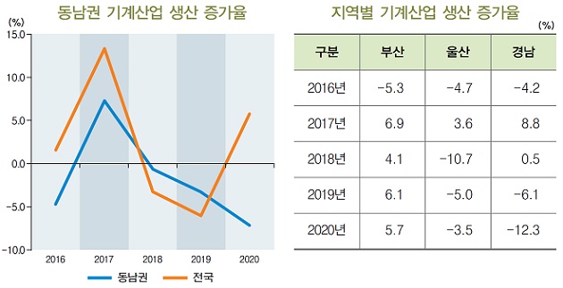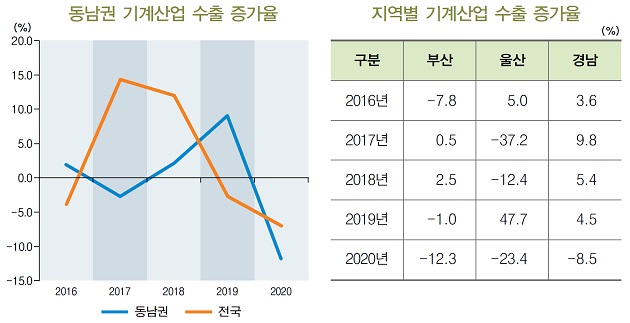올해 동남권 기계산업은 큰 폭의 마이너스 성장률을 기록했다. 지역 주력산업 업황 악화로 내수가 위축되고 코로나19 충격에 따른 글로벌 투자 위축으로 수출도 크게 감소한 데 기인한다.