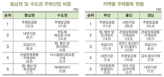 주형 및 금형, 탭·밸브 및 유사장치를 제외하면 동남권과 수도권 주력 품목은 상이한 것으로 파악된다. 동남권의 경우 내연기관(9.7%), 유압기기(8.5%), 건설 및 채광용 기계장비(8.2%) 등이 5대 품목에 포함된 것으로 조사되었다. 반면 수도권은 반도체 제조용기계 14.3%, 디스플레이 제조용기계 3.7%, 액체여과기가 2.9%의 비중을 차지하며 주요품목으로 분류되었다.
