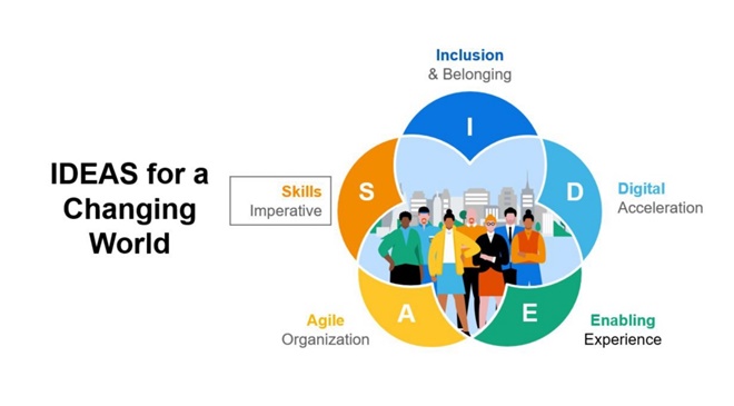 IDEAS는 포용성(Inclusion), 디지털화(Digitalization), 경험 활성화(Enabling Experiences), 민첩한 조직(Agile Organization) 그리고 스킬(Skills)의 앞글자를 따 만든 말이다.