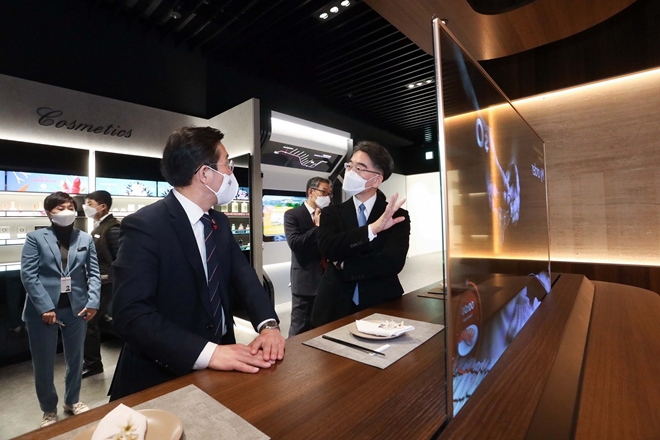 ▲성윤모 장관이 정호영 사장과 투명 OLED로 구성한 레스토랑존에서 환담을 나누고 있다.