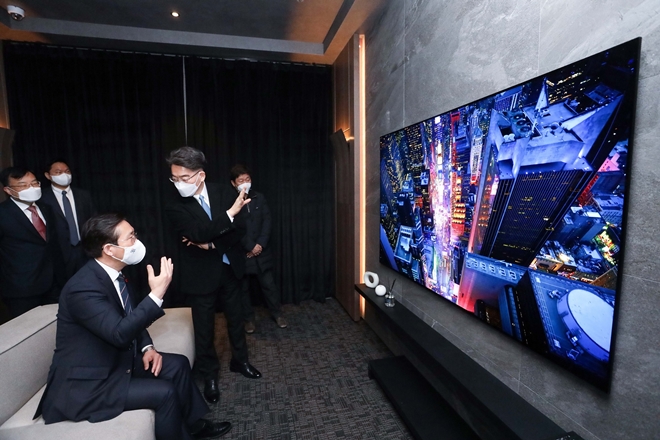 ▲성윤모 장관이 LG디스플레이 88인치 8K OLED의 화질을 감상하고 있다.