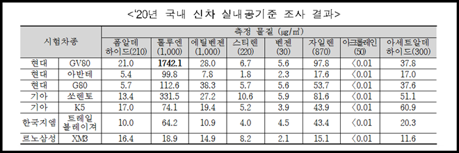 1개 차종, 비발암 물질이지만 두통, 눈 따가움 증상 유발하는 ‘톨루엔’ 권고 기준 초과해
