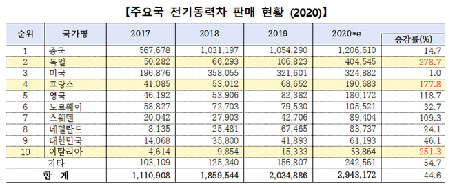 특히 독일, 프랑스, 이탈리아는 정부의 보조금 증액 등 지원확대에 힘입어 전년대비 278.7%, 177.8%, 251.3%로 폭발적인 성장세를 기록했다.