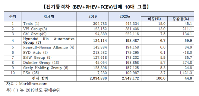 현대차·기아는 전년대비 59.9% 증가한 19만8487대 판매량을 기록하며 3계단 상승한 4위를 차지했다. 작년 3월 체코공장에서의 코나 EV 생산 개시와, 유럽규제 대응을 위한 전기동력차 수출확대 및 국내시장에서의 전기화물차 판매확대 등이 글로벌 판매를 견인했다는 분석이다.