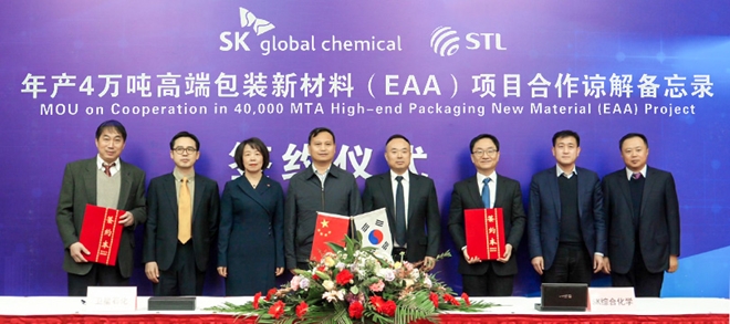 SK종합화학은 중국 화학기업 웨이싱석화와 에틸렌 아크릴산(Ethylene Acrylic Acid, 이하 EAA) 생산/판매를 목적으로 하는 중국 내 합작회사 설립을 위한 업무협약을 체결했다고 11일 밝혔다.