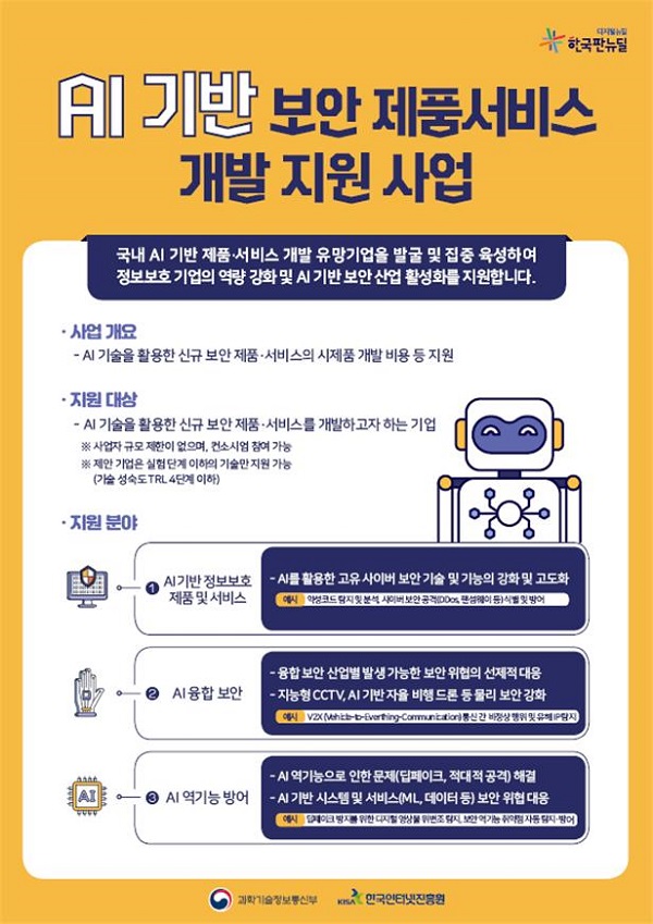 과학기술정보통신부와 한국인터넷진흥원(KISA)은 코로나19 이후 디지털 전환 가속화로 증가한 보안위협에 효과적으로 대응하기 위해 ‘AI 기반 보안 제품·서비스 개발지원’ 사업을 진행한다며 이같이 밝혔다.