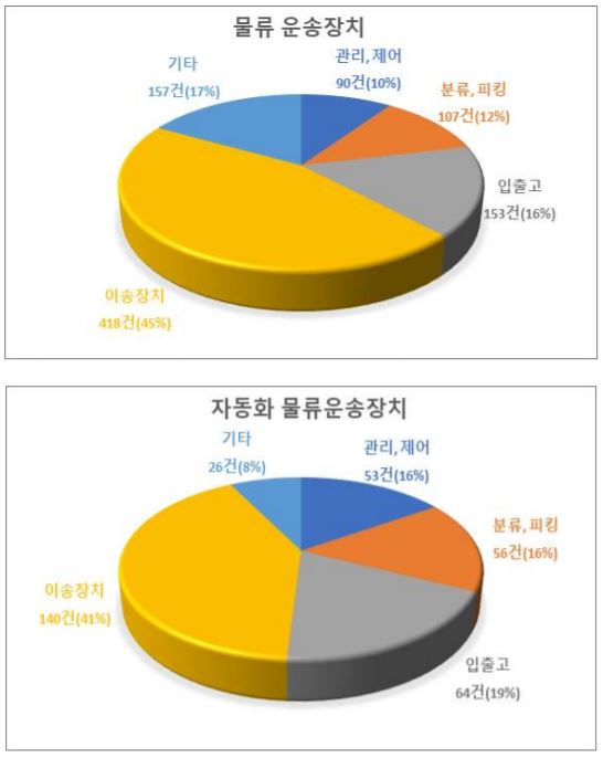 세부 기술분야별로 살펴보면 컨베이어 등을 포함하는 이송장치 관련 출원이 418건으로 가장 많았다. 이어서 하역·입출고 장치와 관련된 출원이 153건, 물품의 분류·피킹1)·포장과 관련된 장치가 107건 등 순이다.