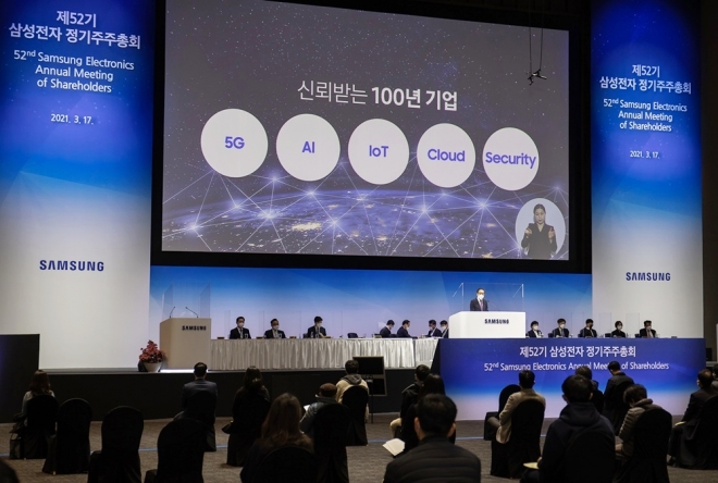 ▲‘삼성전자 제52기 정기 주주총회’에서 김기남 대표이사 부회장이 인사말을 하고 있다. (출처 : 삼성전자)