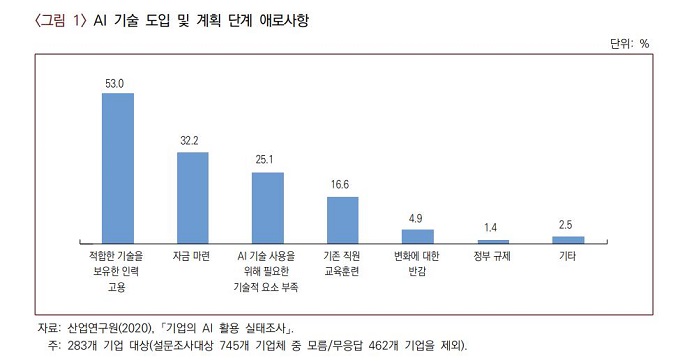 4일 산업연구원이 발표한 '기업의 AI 활용 실태조사' 결과에 따르면, 응답 기업 283개사중 53%는 AI 도입 및 활용의 애로사항으로 '적합한 기술을 보유한 인력 고용의 어려움'을 꼽았다.